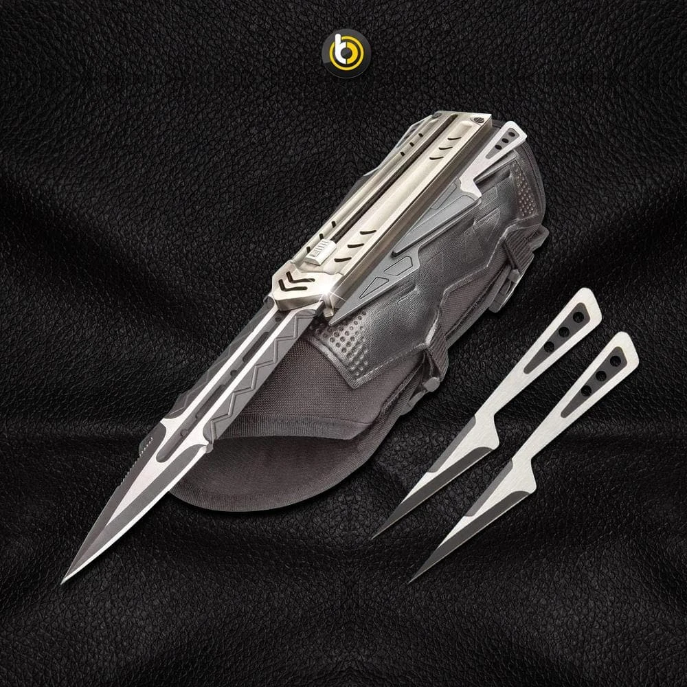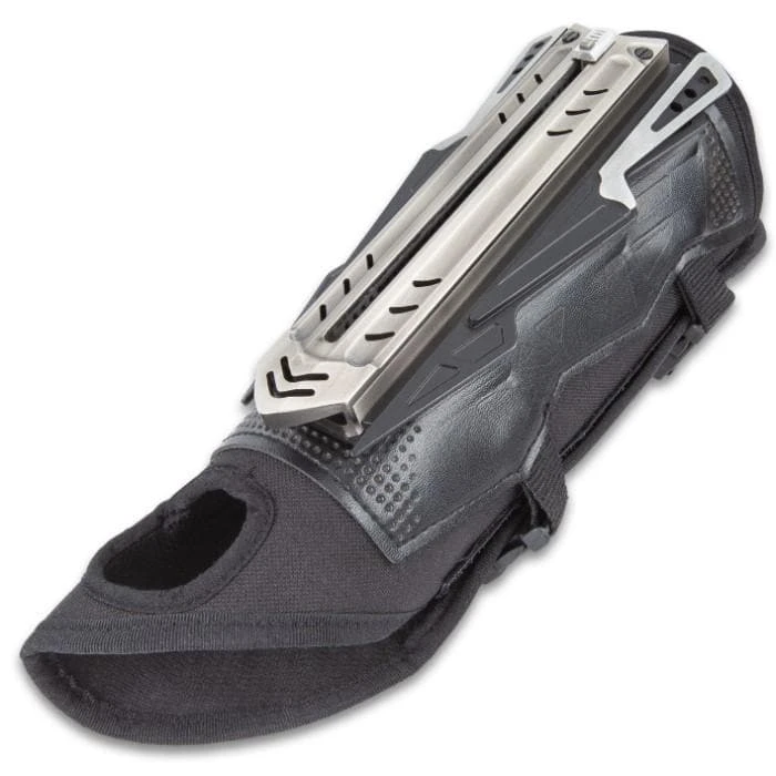 The Enforcer Tactical Gauntlet is a fierce adversary against those who want to try you and they won’t even see it coming! Armed with a razor-sharp, hidden OTF blade and two penetrating throwers, you’re ready for anything. The integrated, stainless steel OTF knife has a 6”, razor-sharp, dagger-style blade with partial serrations and a piercing point. Access the blade with the push button slider, which gives you the option to adjust the blade’s extension from its metal sheath. Each of the two 5 1/2”, one-piece stainless steel throwing knives has a 2 3/4” blade with a needle-sharp penetrating point. The arm sheath is constructed of PU and nylon canvas and fastens securely onto the forearm with Velcro and quick release buckle straps.