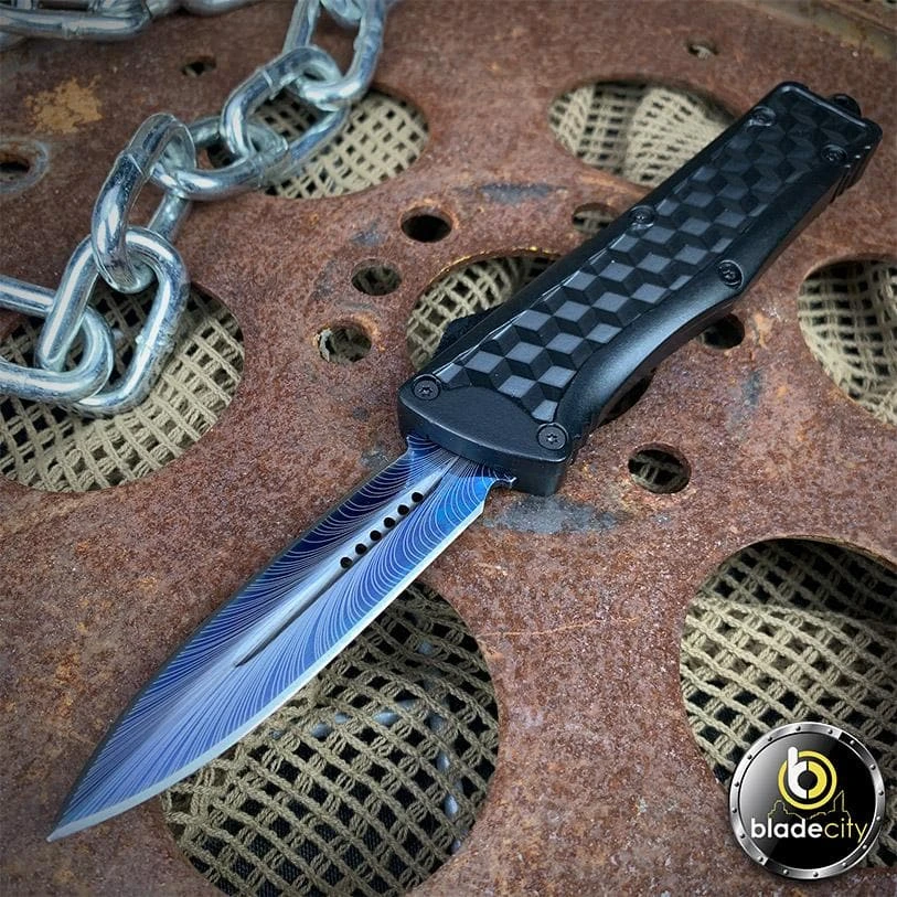 The Blue Vulture OTF comes equipped with custom inserted, heavy duty aluminum zinc alloy handles, and a custom blue double edged blade with a feather design for tackling your toughest cutting jobs. The hardware, pocket clip, glass breaker, and firing switch are bead blasted for a dark stonewash finish. This is a heavy duty knife that will take on even the most extreme cutting tasks. Every OTF Knife comes with a Lifetime Warranty.Â