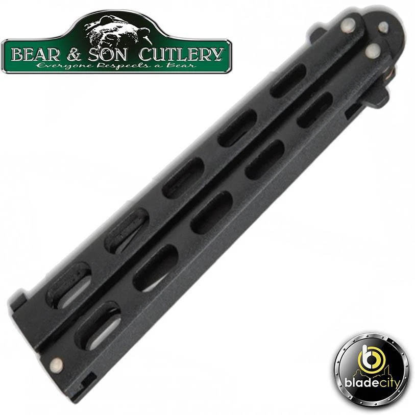 The Bear & Son 115B butterfly knife is built with durable black epoxy coated zinc handles with a skeletonized design for reduced weight. It features a stainless steel drop point blade with a black coating that matches the handles for a unified aesthetic. This is a solid mid-range butterfly knife, made right here in the USA.