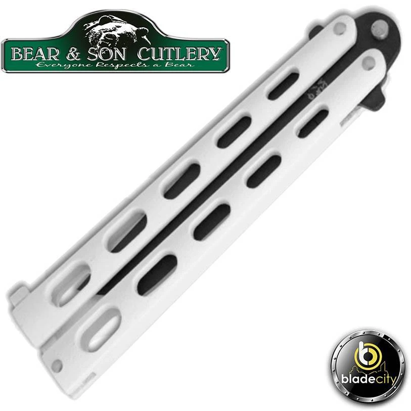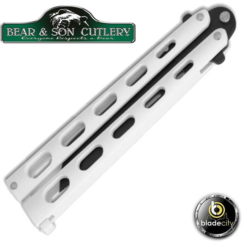 The Bear & Son 115 butterfly knife is built with durable white epoxy coated zinc handles with a skeletonized design for reduced weight. It features a 440 stainless steel blade with a black coating. This is a solid mid-range butterfly knife, made right here in the USA.