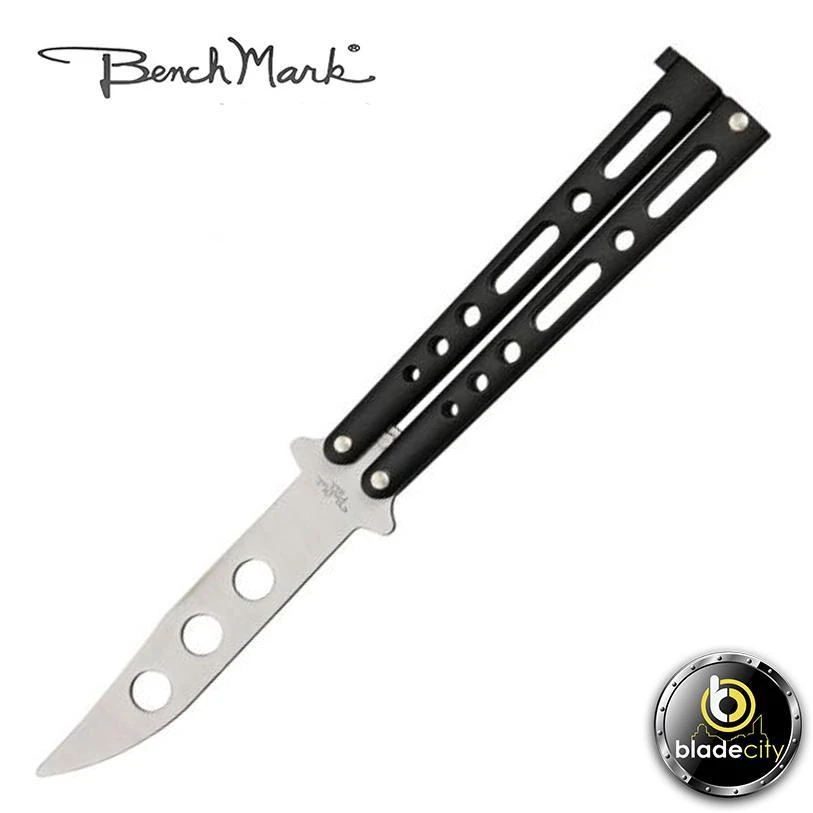 The BenchMark large black butterfly training knife has a clip point stainless steel blade with a satin finish and dull edges and a double tang pin design for great performance. This model has extra thick cast metal handles that are Skeletonized and finished with a black finish. The stainless steel handles give the knife a solid feel with cutouts for handsome looks. Overall this balisong has great action, good looks, a fantastic price and it is made in the USA.