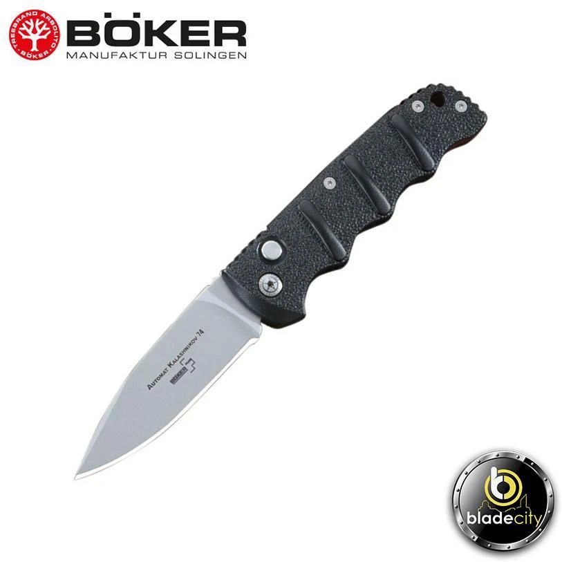 This Kalashnikov knife has a black coated AUS-8 stainless steel blade. The comfortable handle is black finished aluminum with molded finger grips and jimping where the handle and blade meet. The design is thin, elegant and comfortable. The action of this knife is first rate and comparable to that of the Boker Magnum series. As with other Kalashnikov knives, this one comes with a pocket clip for easy tip-up carry.