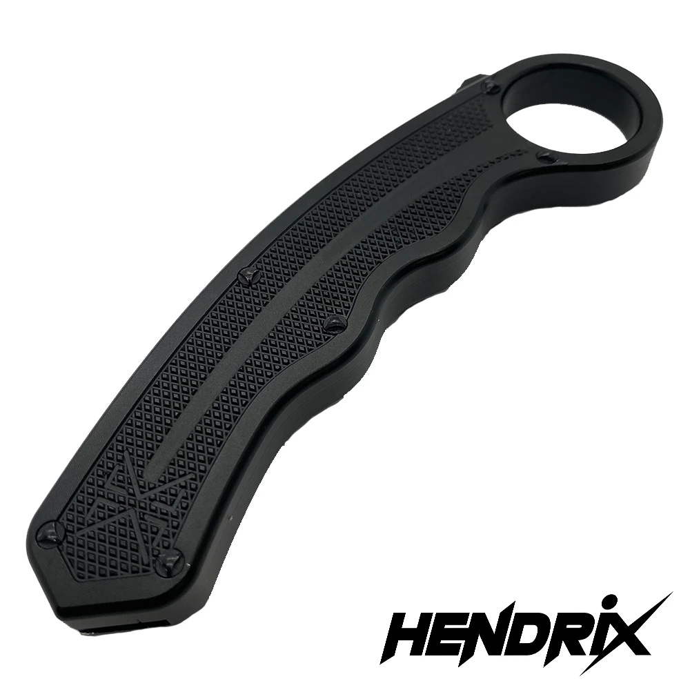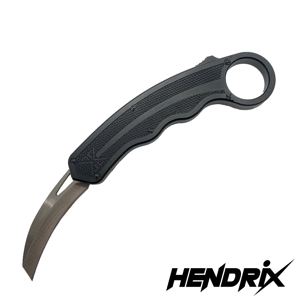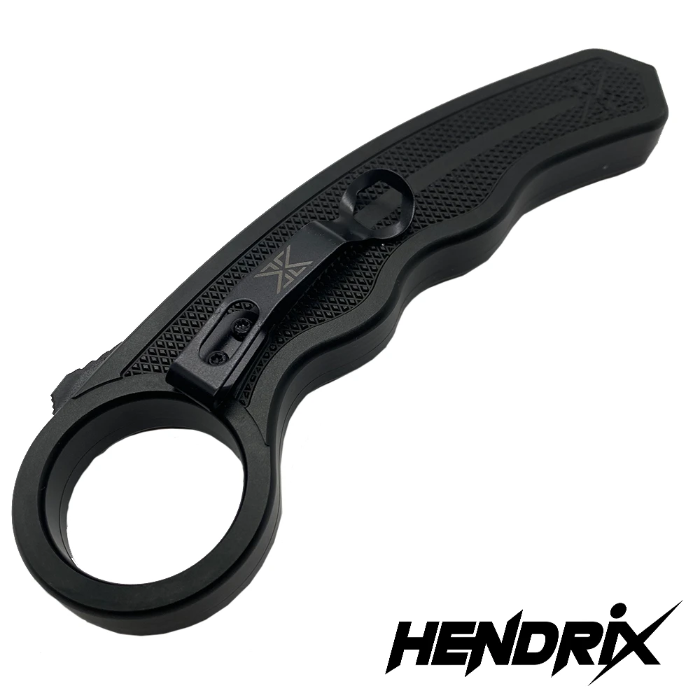 One part karambit and one part double-action OTF comes the awesome Karambit OTF from Hendrix Gear. With powerful, reliable action the D2 hawkbill blade shoots in and out, following the curvature of the handle. The knife comes standard with CNC aviation aluminum handle. All CNC construction of this OTF from Hendirx Gear makes for a precision fit and finish not only on the exterior of the knife but also on the inside operating components as well. It also includes a deep carry pocket clip, and a retention ring. The retention ring and allows for reverse grip deployment via its smart button configuration. Add this revolutionary conglomeration of your favorite tactical tools to your collection today!