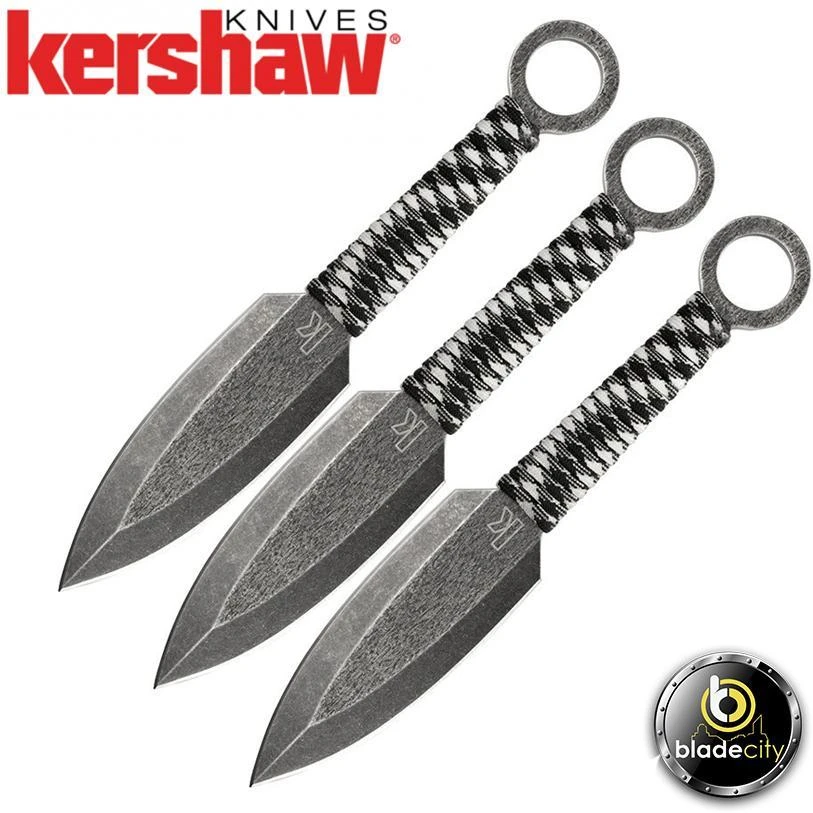 We have to admit it; throwing knives is fun. But throwing just any knife is dangerousand not very smart. To throw knives, knives specially designed for throwing are required. Thats why Kershaw made the Ion Throwing Knife Set. The three knives in the set are designed to have the correct weight and balance for target throwing. Kershaws Ion knives are double-edged, spear-point blades. We made these full-tang knives from sturdy, high-chromium stainless steel and wrapped the handles in durable, sure-grip paracord. The extra-wide ring at the end adds balance, offers a great place to attach a lanyard, and makes it easy to remove the knives from the sheathor from the target. All three knives fit neatly in the nylon carrying and storage sheath, which makes it easy to take them out to the throwing range.