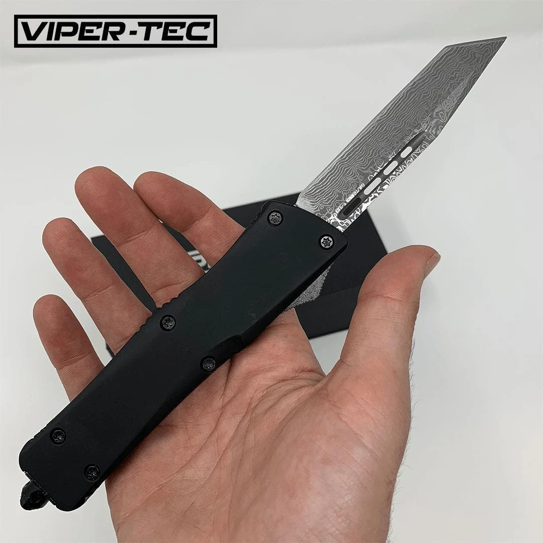 Like all Viper Tec knives, the Damascus Ghost Tanto is built for hard use. Each Knife comes with a 3.5-inch 440c blade that have been hand sharpened to an extremely sharp edge ready to cut right out of the box. The smooth ergonomic handles are made of high-quality Zinc Alloy. The button placement along the spine of the handle allows for lighting fast ambidextrous openings right from the operators pocket. The Damascus Ghost Tanto also allows for right and left-hand users to pocket carry with its stainless steel reversible pocket clip. If that wasn’t enough the Damascus Ghost Tanto knife also comes equipped with a “battle tested” glass breaker pommel.