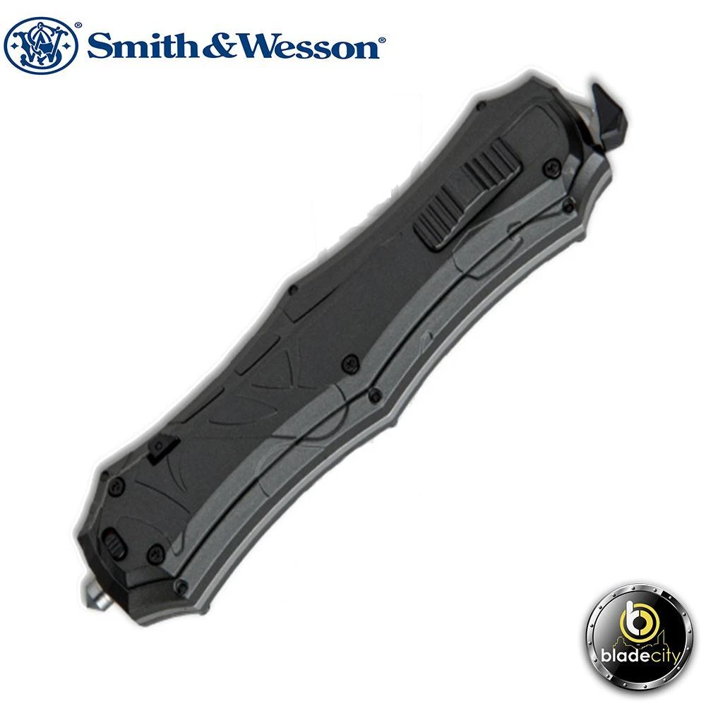 This Smith & Wesson OTF sports a black spear point blade and a stainless steel handle. The OTF Assist Finger Actuator offers spring assisted opening action that flies open at the push of a button. A locking feature at the top of the handle releases the blade for manual closing. The handle has a machined design for improved grip and added style. It also includes a stainless steel pocket clip for tip-down carry. A sliding safety keeps the blade secure in the closed position.