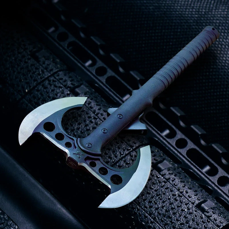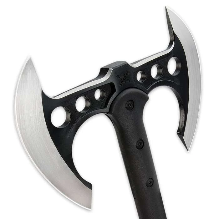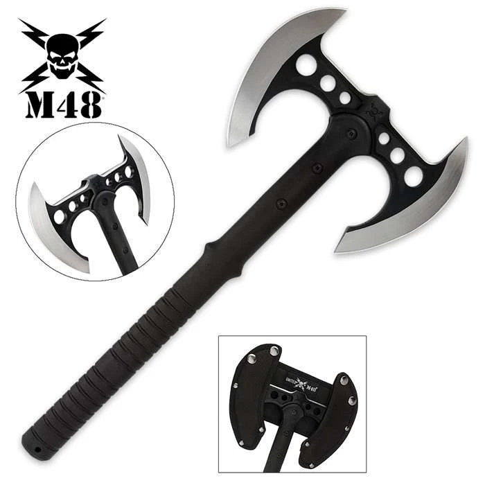 You’ve been asking for it, and United Cutlery has delivered in a big way with this all new double-bladed tactical tomahawk from the best-selling M48 lineup. This bad boy does double duty with two 5 1/2″ sharpened blades. The cast stainless steel head is thick, hefty and built for durability and strong use. The black oxide coating gives this tomahawk a tactical look and feel, further emphasized by the virtually indestructible nylon and fiberglass reinforced handle. The reinforced M48 nylon blade sheath allows you to carry it right on your belt, safely and comfortably.